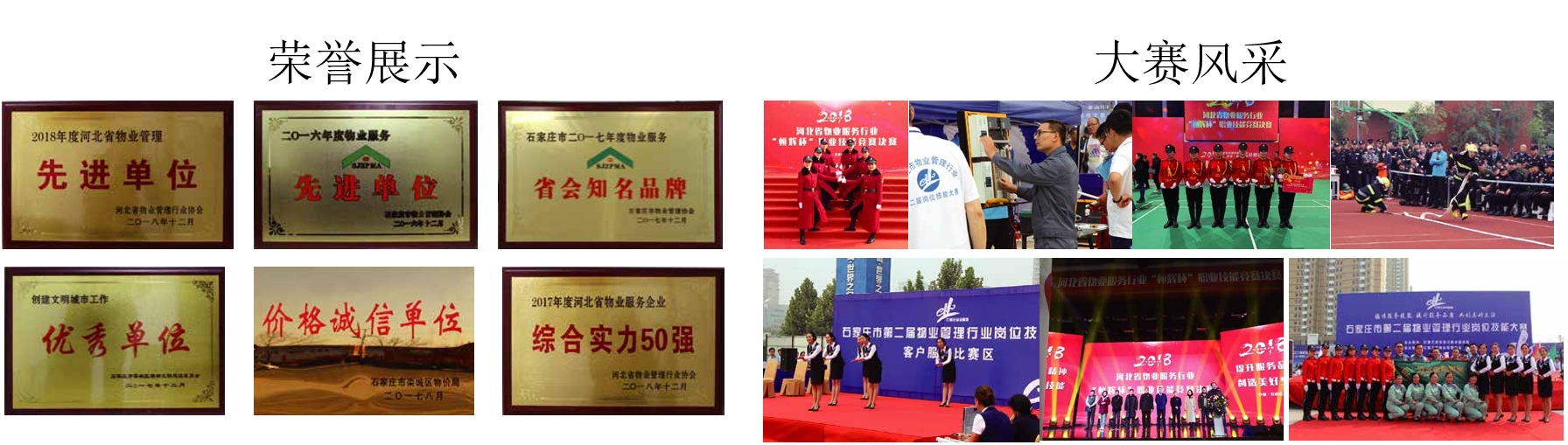 “首届石家庄市物业管理行业岗位技能大赛”中荣获“环境保洁一等奖"、“秩序维护三等奖” 、"团体优胜奖” 、“企业风采奖” ;
