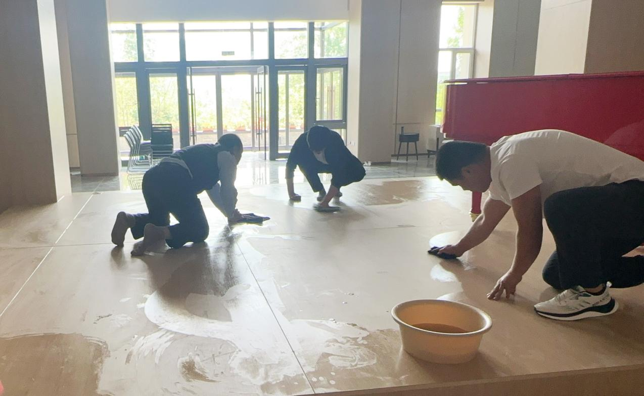2024年5月8日,自然城里阳光明媚,鸟语花香。老吴、来自台湾长庚的养老顾问陈丽红博士和养老示范区项目负责人张力涛及团队伙伴们,从示范区的一楼大堂开始,一点点擦地板、刷马桶、清理灰尘,保洁工具达不到的位置就趴下来用抹布一点点擦,用手指一点点抠,一刻不停地刷、擦、拧、刮、扫......,无论是地板缝隙、卫生间还是墙壁胶渍,大家要做到现场一尘不染、焕然一新。
